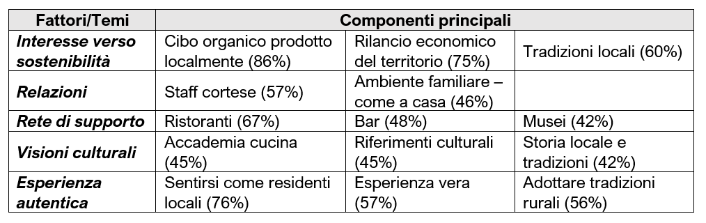 Interesse verso sostenibilità Cibo organico prodotto localmente (86%) Rilancio economico del territorio (75%) Tradizioni locali (60%) Relazioni Staff cortese (57%) Ambiente familiare – come a casa (46%) Rete di supporto Ristoranti (67%) Bar (48%) Musei (42%) Visioni culturali Accademia cucina (45%) Riferimenti culturali (45%) Storia locale e tradizioni (42%) Esperienza autentica Sentirsi come residenti locali (76%) Esperienza vera (57%) Adottare tradizioni rurali (56%)